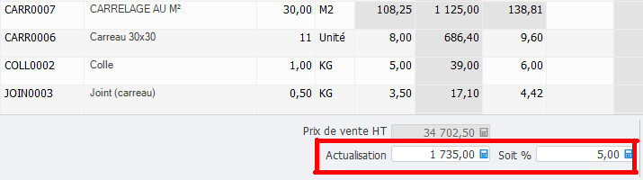 Dans EBP Bâtiment, l’actualisation est une opération très simple car vous insérez dans votre pied de devis le % d’actualisation qui se répercutera automatiquement sur chaque prix unitaire de votre devis